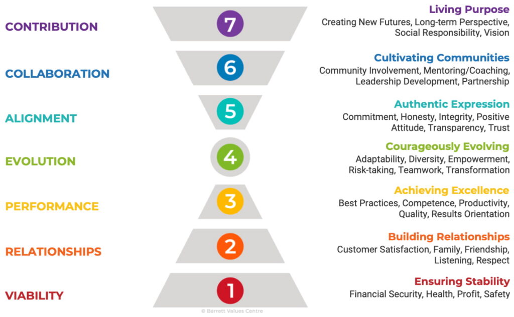 The Barrett Values Model describes seven levels of values that show how people and organizations think, decide, and act. It reveals which values currently shape the culture, which are unconsciously missing, and which are critical for future success.